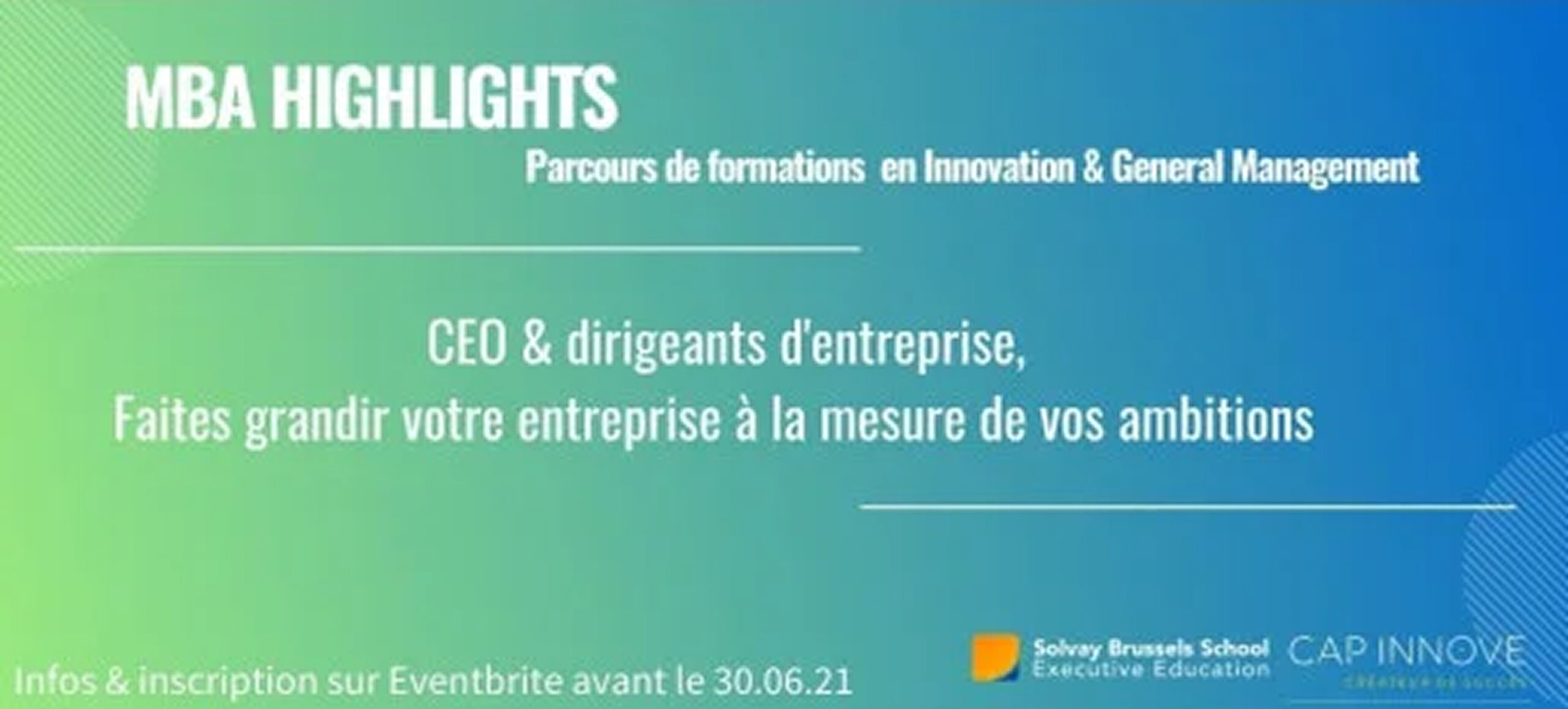 En septembre dernier, CAP Innove et Solvay Executive Education ont lancé un MBA Highlights, un programme qui combine efficacement un parcours de formations en Innovation et General Management de haut niveau à l’analyse de cas d’affaires récents et concrets tout en intégrant un volet coaching. Il s’agit d’un condensé d’un MBA classique qui se concentre sur l’essentiel des techniques de leadership, stratégie, finance, marketing & vente et RH. Ce programme exclusif s’adresse aux entrepreneurs et aux CEO de PME qui ont une volonté de faire croitre leur entreprise et prendre un peu de recul sur leur développement actuel.